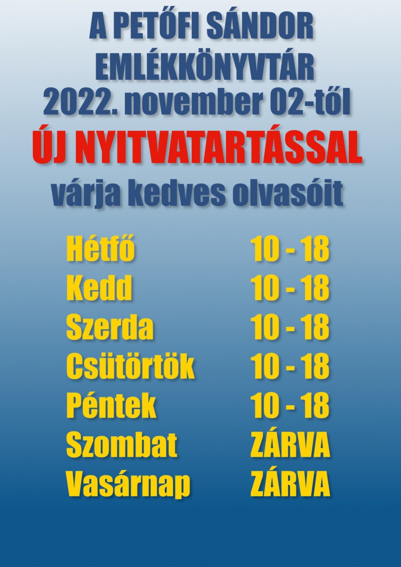a Petőfi Sándor Emlékkönyvtár november 2-tól kedden sem tart szünnapot, így hétfőtől péntekig minden nap 10 és 18 óra között nyitva tart.
