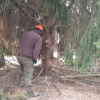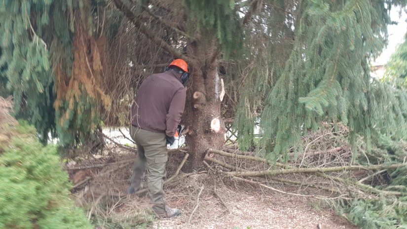 A favágók is nekiláttak a munkának. Először alul legallyazzák a fát, majd egyikük felmászik a fára, hogy felcsatolja a hevedereket. Ekkor rákötik majd a darura, majd alul elvágják a fenyőt és kiemelik a helyéről.