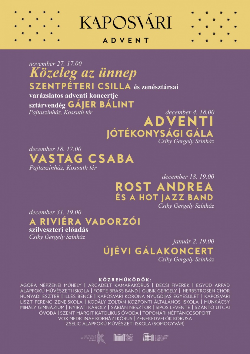 Advent első vasárnapján, Közeleg az ünnep címmel Szentpéteri Csilla és zenésztársai varázslatos adventi koncertjét hallhatják majd az érdeklődők a Kossuth téren, a sztárvendég pedig Gájer Bálint lesz. Advent második vasárnapján Jótékonysági Gálát szerveznek a Csiky Gergely Színházban. Advent negyedik vasárnapján a Kossuth téren Vastag Csaba szórakoztatja majd a közönséget, a Csikyben pedig Rost Andrea és a Hot Jazz Band lép fel majd fel.