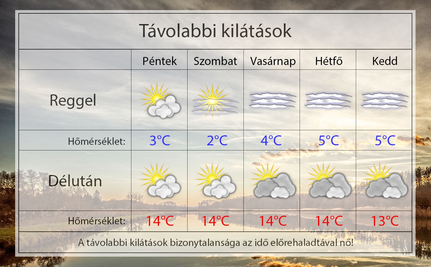 Pénteken reggel 3 °C-ig hűl a levegő. Megnyugszik időjárásunk. Napközben a közepesen felhős ég mellett napos idő várható és délután 14 °C-ig kúszik fel a hőmérő higanyszála a gyenge északi szél mellett.