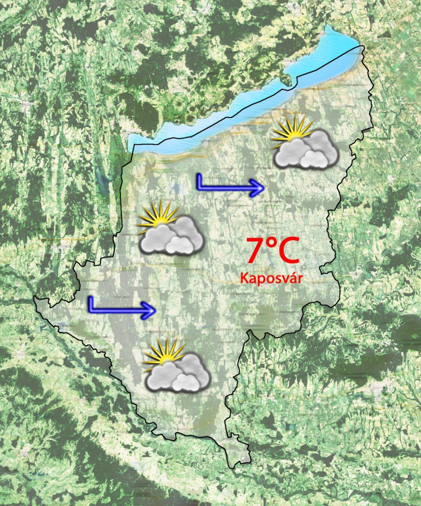 Csütörtök reggel 3 °C-ig csökken a hőmérséklet a borongós ég alatt. Napközben is sok lesz a felhő és előfordulhat néhol kisebb záporeső. Délután 7 °C-ig emelkedik a hőmérő higanyszála. Gyengén fúj majd a nyugati szél.