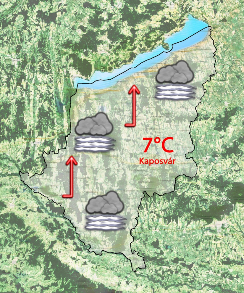 Péntek napközben borongós, párás lesz az ég. Délután 7 °C-ig emelkedik a hőmérő higanyszála. Gyenge déli szél fúj majd. Este egy csapadéksáv érkezik.