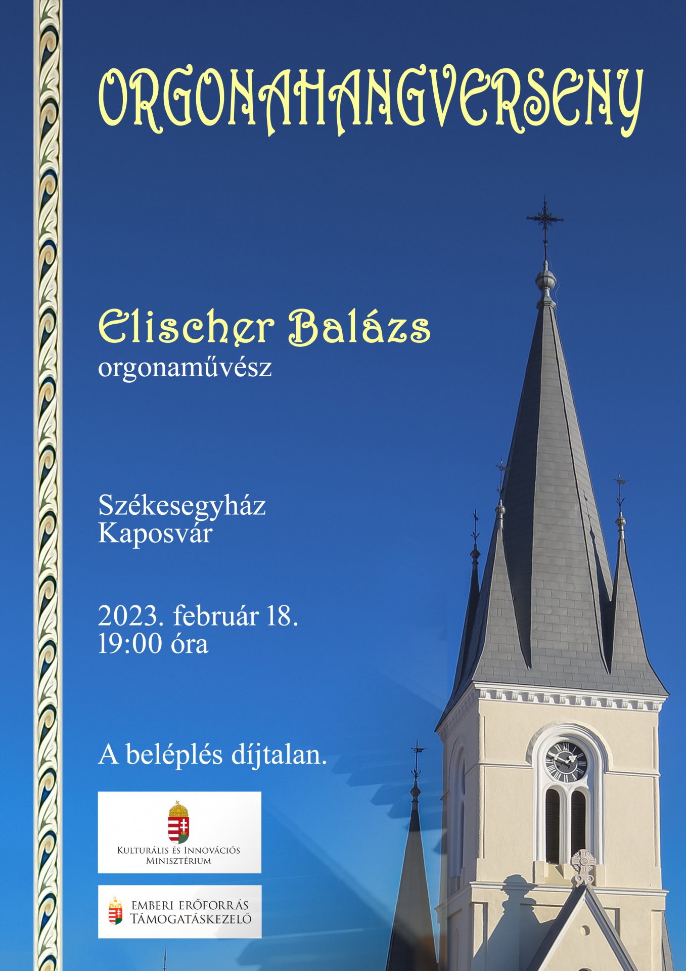 Orgonahangversenyt tartanak február 18-án Kaposváron. Szili Zoltán egyházmegyei zeneigazgató arról tájékoztatta szerkesztőségünket, hogy Elischer Balázs orgonaművész ad majd koncertet. Az orgonahangverseny este hét órakor kezdődik majd a Nagyboldogasszony-székesegyházban, a belépés pedig díjtalan.