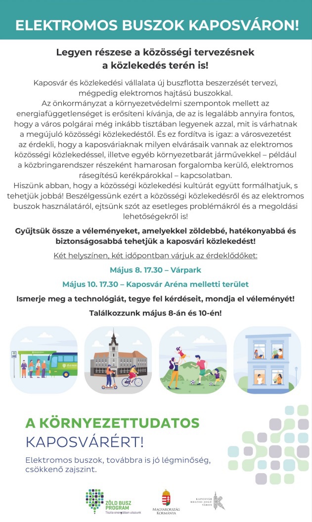 Május 8-án 17.30-kor a Várparkban, május 10-én 17.30-kor pedig a Kaposvár Aréna melletti területen várják a lakosság véleményét, észrevételeit arról, hogyan tehető még zöldebbé, még hatékonyabbá és biztonságosabbá Kaposvár közlekedése.