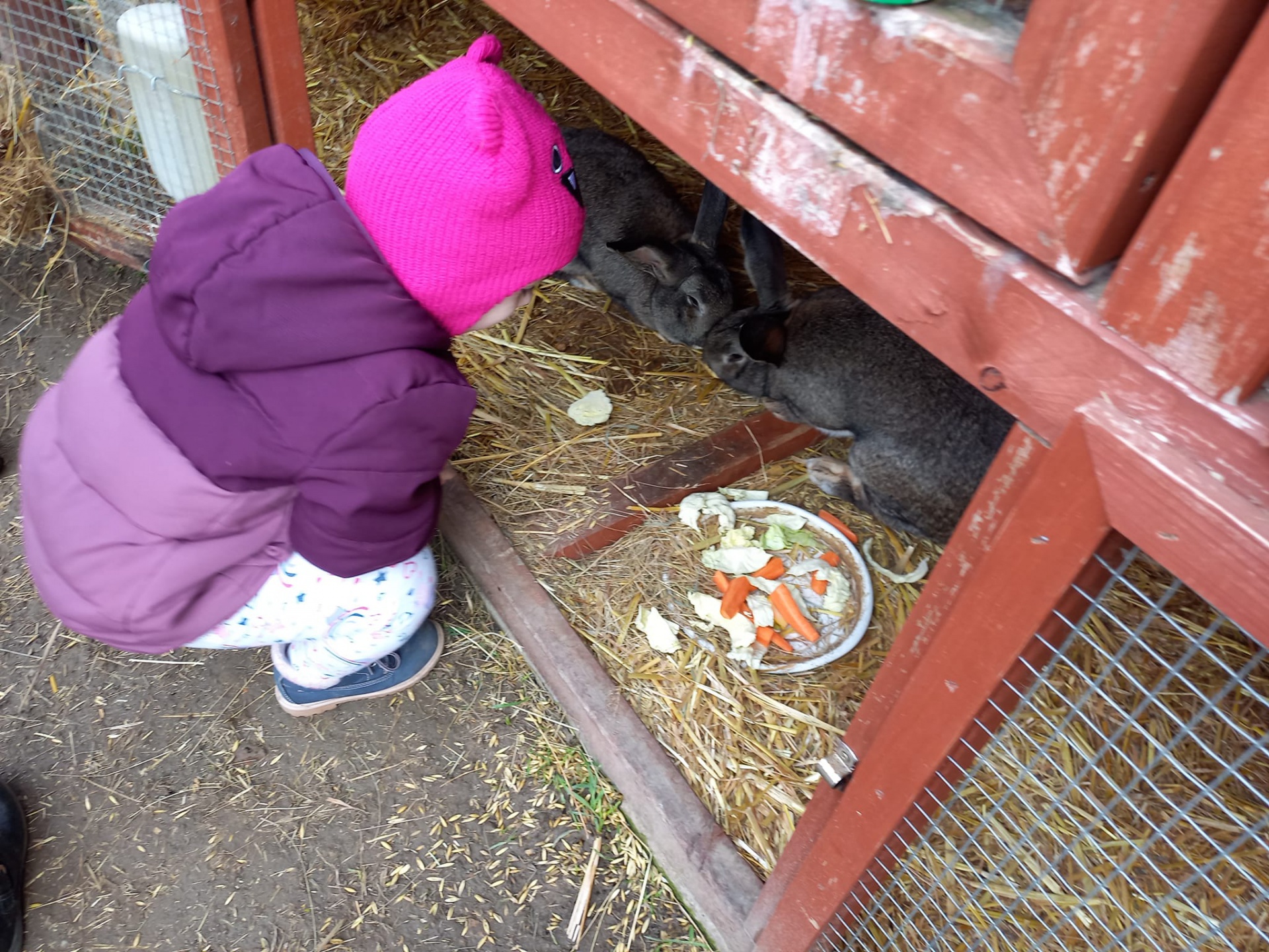 A növények mellett állatokról is gondosnak az óvoda szorgos kis kezei. A nyulakat zabbal és szénával etetik, a tyúkok elé pedig búzát szórnak. Az állatokat heti váltásban gondozzák a csoportok, de emellett bármikor odamehetnek és megnézhetik őket.