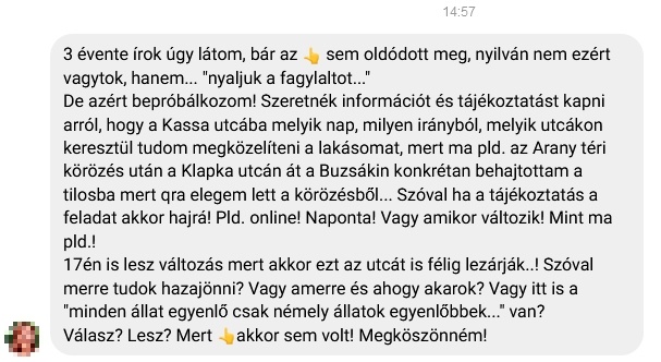 "Sziasztok! A Pécsi utcánál nem működik a sorompó, mondjátok majd be légyszi!"