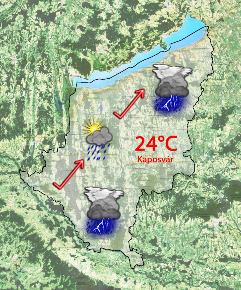 Szerdán napközben erősen felhős lesz az ég. Délutánra elszórtan kialakulhatnak záporok, zivatarok szinte bárhol. Néhol felhőszakadás is lehet. 24°C-ig melegszik fel a levegő hőmérséklete. Gyenge lesz a déli szél.