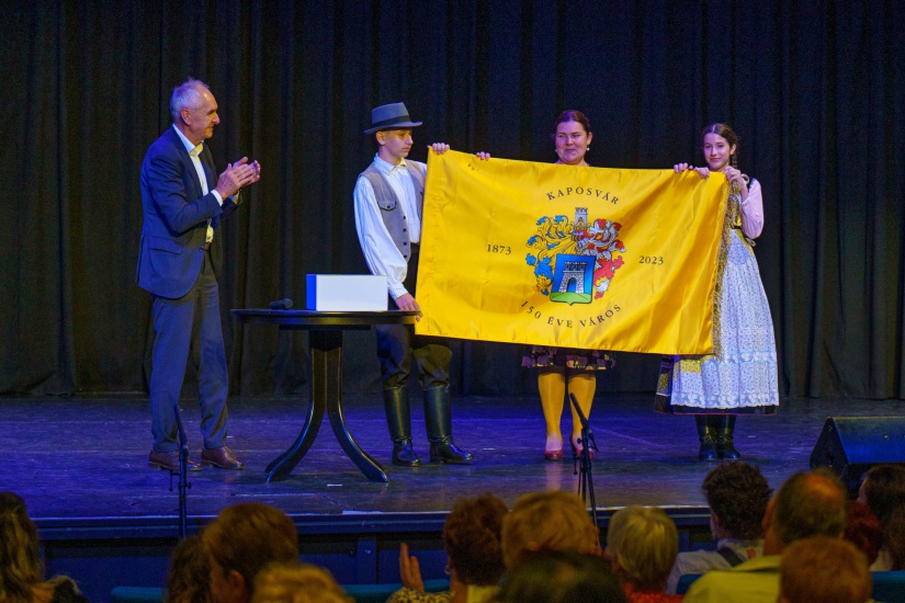 Szita a 150 éves Kaposvár történetéről is beszélt és több más intézményhez hasonlóan a művészeti iskolának is adományozott egy emlékzászlót.