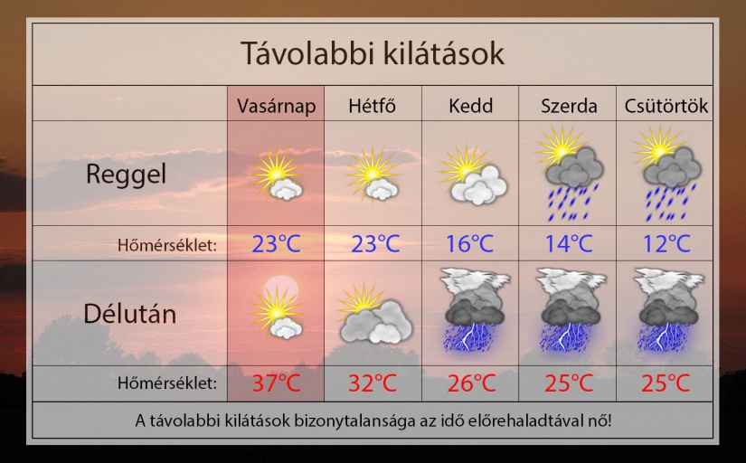 Vasárnap 23°C-ig hűl a levegő a gyengén felhős ég alatt. Napközben nagyon meleg lesz a sok napsütés mellett. Délután 37°C-ig kúszik fel a hőmérő higanyszála, de lehetnek olyan hőszigetek, ahol ennél melegebb lehet. Gyenge lesz a déli szél.