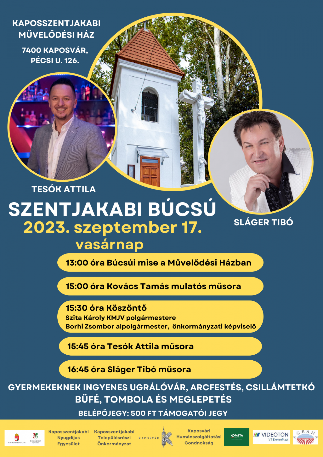 Jövő vasárnap rendezi meg a Szentjakabi Búcsút a Kaposszentjakabi Településrészi Önkormányzat és a Kaposszentjakabi Nyugdíjas Egyesület. A programok délután egy órakor kezdődnek majd a Művelődési Háznál.
