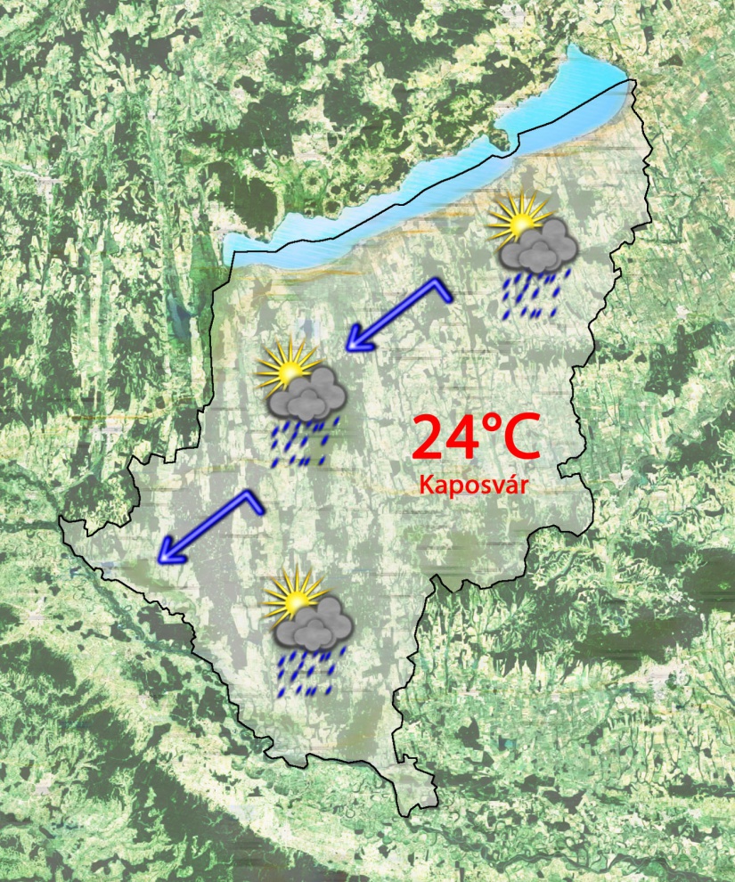 Hétfőn délután még erősen felhős lesz az ég és többfelé várható záporeső. 24°C-ig melegszik a levegő. Gyenge lesz az északkeleti szél.