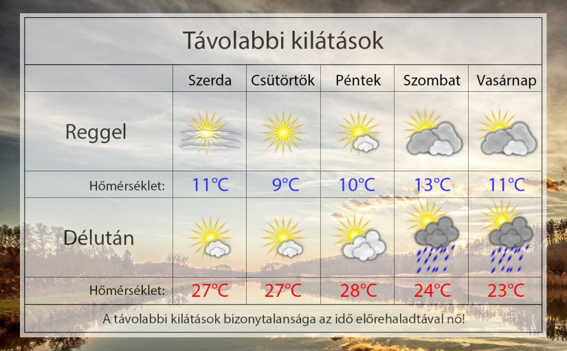 A hét második felében marad a nyári idő. Csapadékra ismét a hétvégén kell számítani egy hidegfront kíséretében. Reggelente 9-12°C-ig hűl a levegő, míg napközben 26-29°C-kal még igazi nyárias idő lesz. Reggelente előfordulhatnak köd- és párafoltok, de ezek a napkeltét követően feloszlanak.