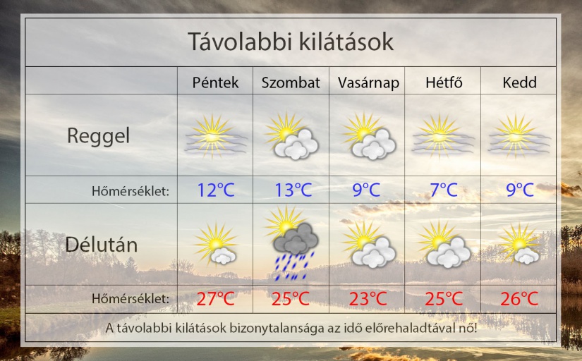 A hétvégén szombaton egy gyenge hidegfront érkezik és megnövekszik a felhőzet. Esetleg záporeső, kisebb eső szórványosan előfordulhat. Komoly időjárásváltozás nem valószínű. Vasárnap már nyugodt idő várható gyenge északi széllel és közepesen felhős éggel. A jövő héten ismét nyugodt, későnyárias idő lehetséges, de reggelente már többfelé lehetnek köd és párafoltok. A hétvégére a maximumok néhány °C-ot csökkennek majd a front miatt. 23-26°C lehetséges, míg a reggelek frissek lesznek majd 7-12°C-al.