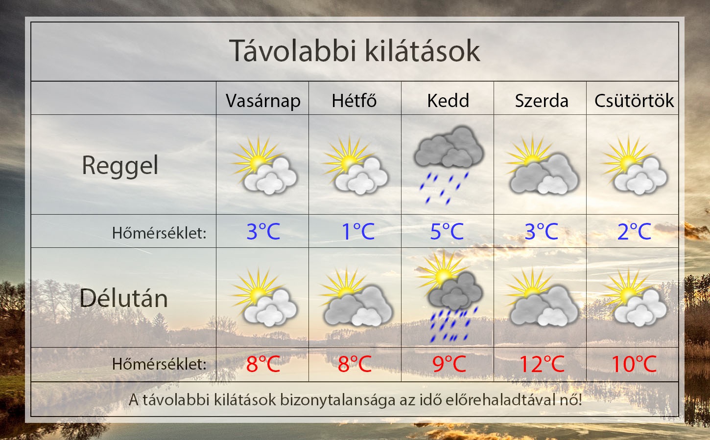 Vasárnap már nyugodt, napos idő várható, de reggel 2°C-ig hűl a levegő a derült ég alatt. Napközben változóan felhős lesz az ég. Délután 8°C-ig emelkedik a hőmérő higanyszála. Gyenge nyugati szél fog fújni.