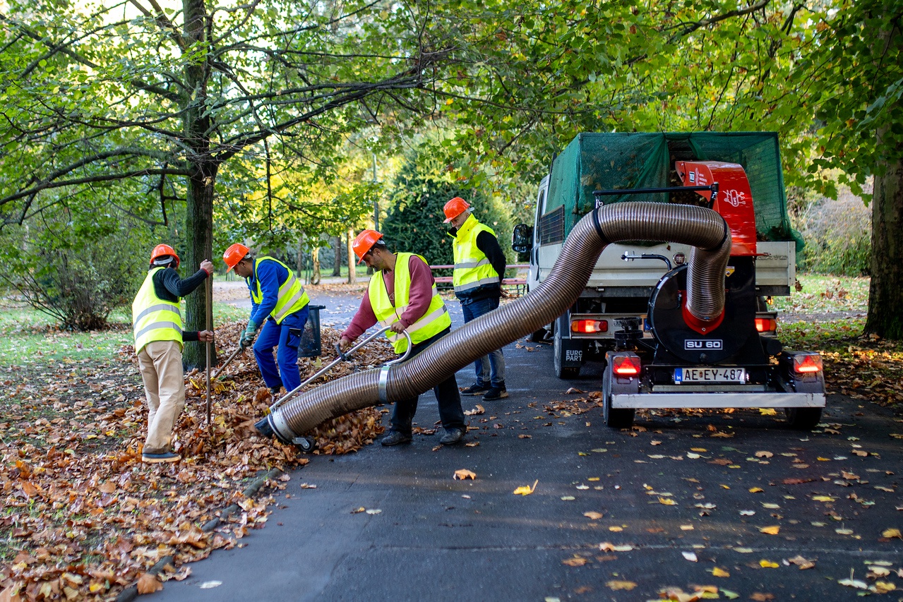 A Sávháznál is takarítják a lehullott faleveleket