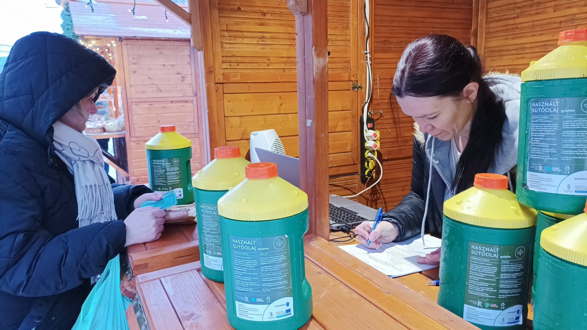 Tóth-Fábos Viktória meglepődve vette észre a sétálóutcán szerda délután azt a faházat, amelynek kínálatában nem forralt bor és kürtőskalács szerepelt, hanem a híradásokból már jól megismert, zöld olajgyűjtő edények sorakoztak. A fiatal hölgy élt is a lehetőséggel, lakcímkártyája és személyi igazolványa bemutatását követően át is vette a palackot. Mint lapunknak elmondta, eddig a munkája miatt nem tudott elmenni érte, noha tudatos gyűjtőnek számít, eddig a benzinkúton adta le a háztartásában keletkező használt sütőolajat.