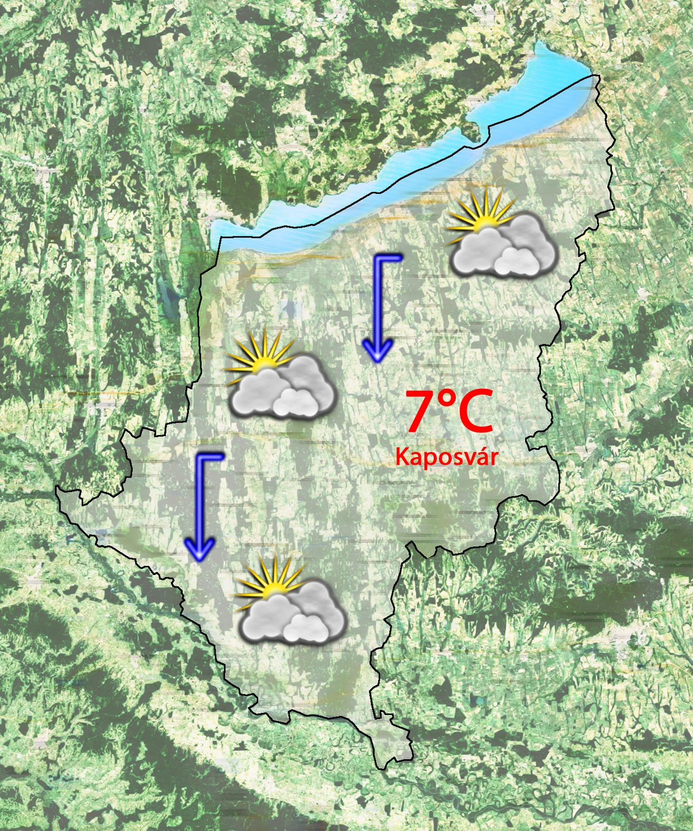 Csütörtök reggel 0°C-ig csökken a hőmérséklet a borult, ködös ég alatt. Napközben erősen felhős lesz az ég. Délután 7°C-ig kúszik fel a hőmérő higanyszála. Gyenge délnyugati szél fúj majd.