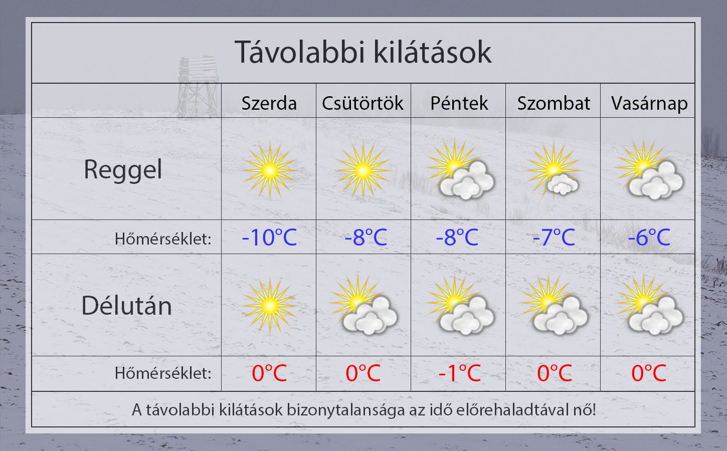 A hét második felében marad a téli idő. Csapadéktól a hétvégén sem kell tartani. Reggelente -7-11°C-ig hűl a levegő, míg napközben -2-0°C-kal igazi télies idő lesz. Csütörtöktől kicsit több lehet a felhő, de zömmel gyengén felhős, napos idő várható.