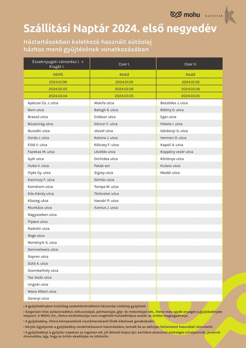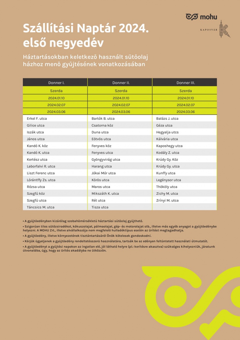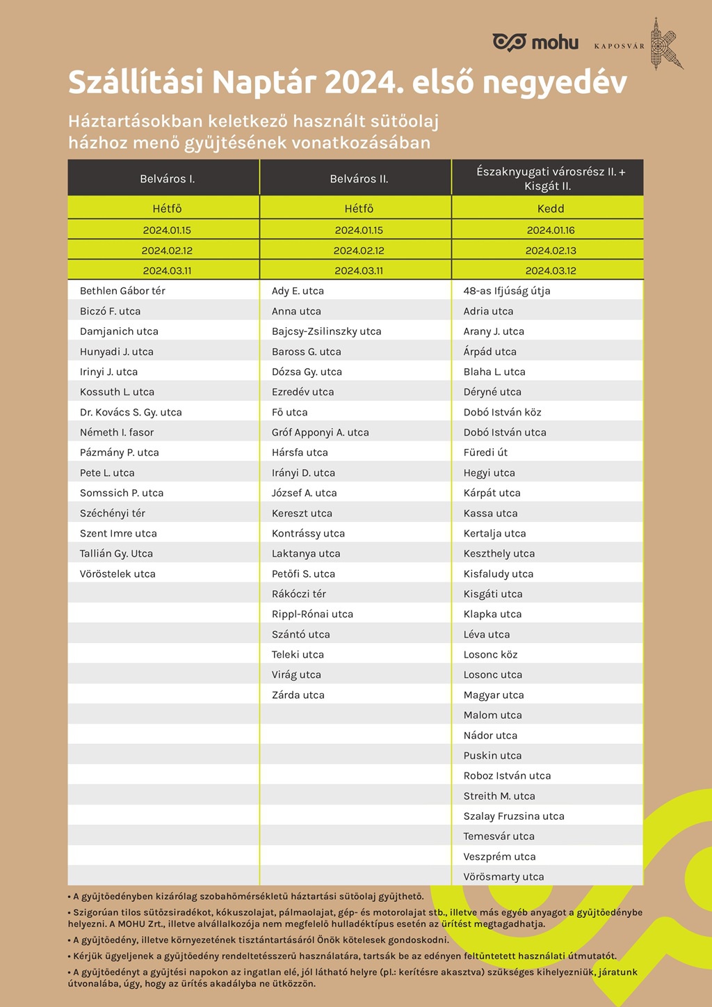 Azt, hogy az év első három hónapjában melyik utcában melyik napon viszik el a sütőolajat, azt lefele görgetve tekinthetik meg.