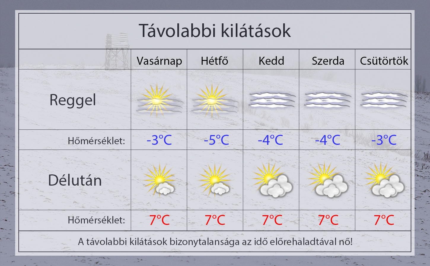 Vasárnap -3°C-ig hűl a levegő a gyengén felhős ég alatt, de közben megjelenhetnek a ködfoltok. Napközben napos idő várható. 7°C-ig melegszik a levegő. Gyenge lesz az északi szél.