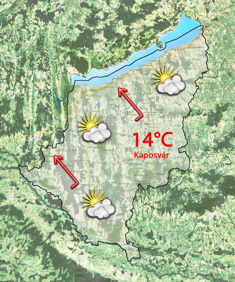 Csütörtök reggel -2°C-ig csökken a hőmérséklet a közepesen felhős ég alatt. Napközben megnövekszik a felhőzet. Délután 12°C-ig kúszik fel a hőmérő higanyszála. Gyenge déli szél fúj majd.