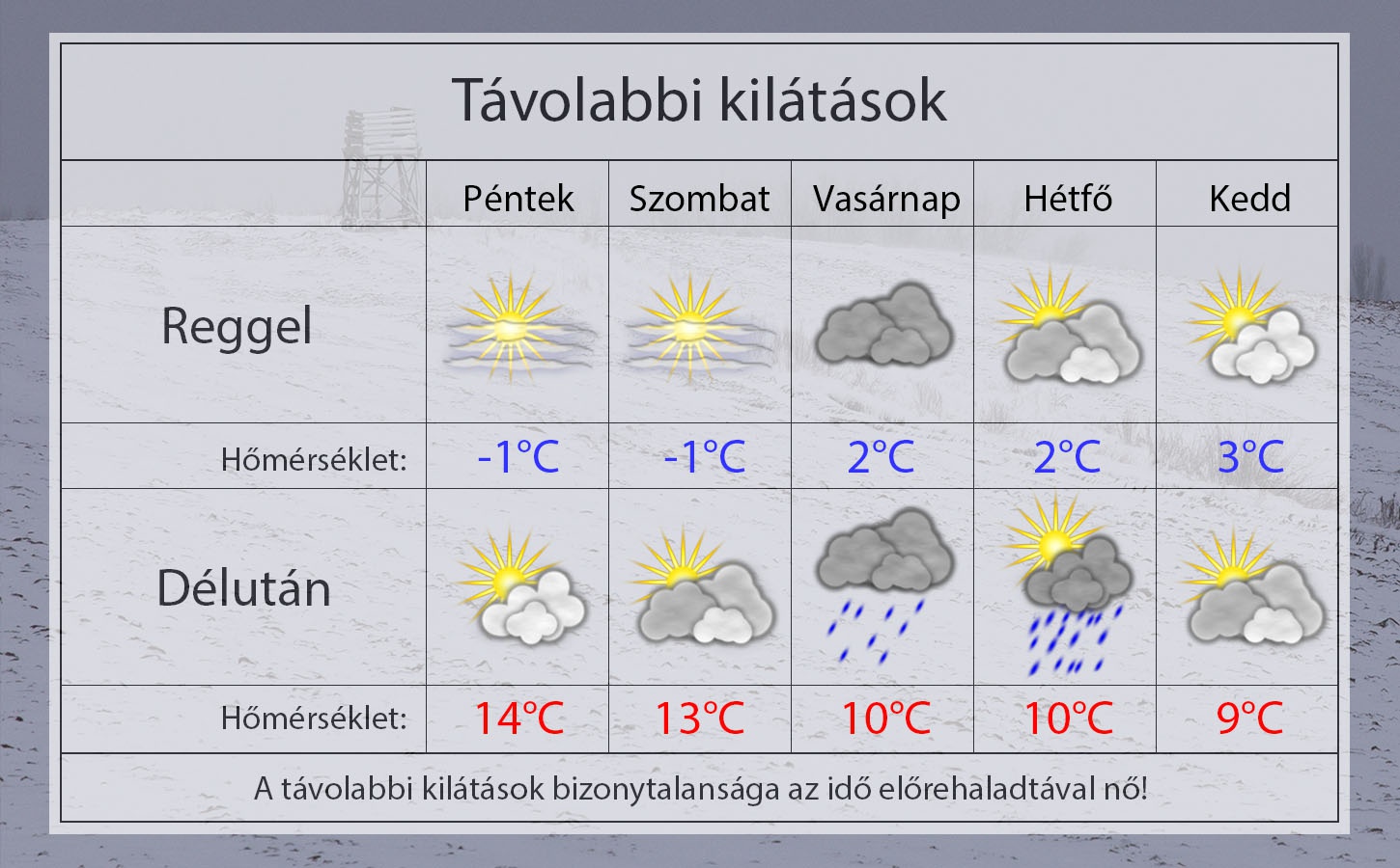 Pénteken reggel gyengén felhős lesz az égbolt és -2°C-ig hűl a levegő. Előfordulhatnak köd és párafoltok. Napközben 14°C-ig kúszhat fel a hőmérő higanyszála. Gyenge lesz a délkeleti szél.