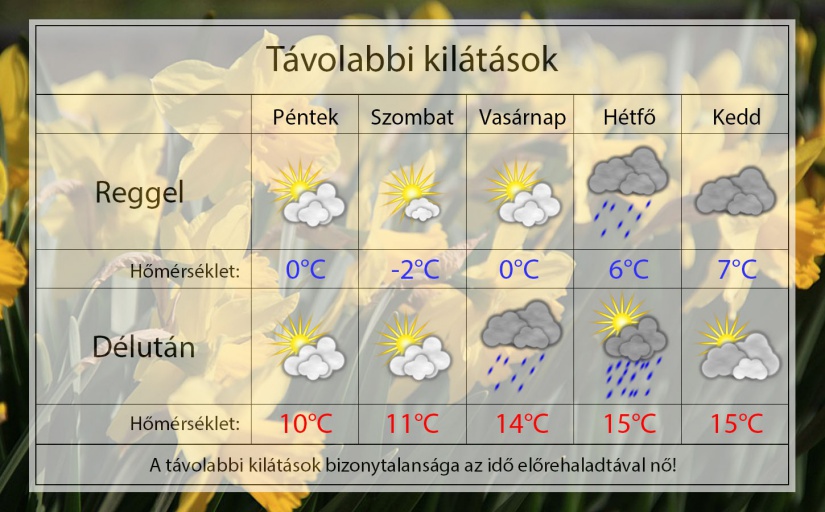 Pénteken reggel gyengén felhős lesz az égbolt és emiatt akár fagypontig is hűlhet a levegő. A völgyekben fagyni fog. Napközben közepesen felhős lesz az ég. 10°C-ig kúszik fel a hőmérő higanyszála. Gyengén fúj majd a keleti szél.