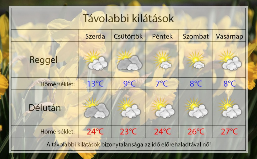 Szerdán reggel eleinte változóan felhős égboltra tekinthetünk fel. 13°C-ig hűl csak a levegő. Egy gyenge hidegfront hatására megnövekszik a felhőzet, de csapadék csak elvétve lehet gyenge eső formájában. Napközben 24°C-ig kúszik fel a hőmérő higanyszála. A front érkezésével megélénkül az északi szél.