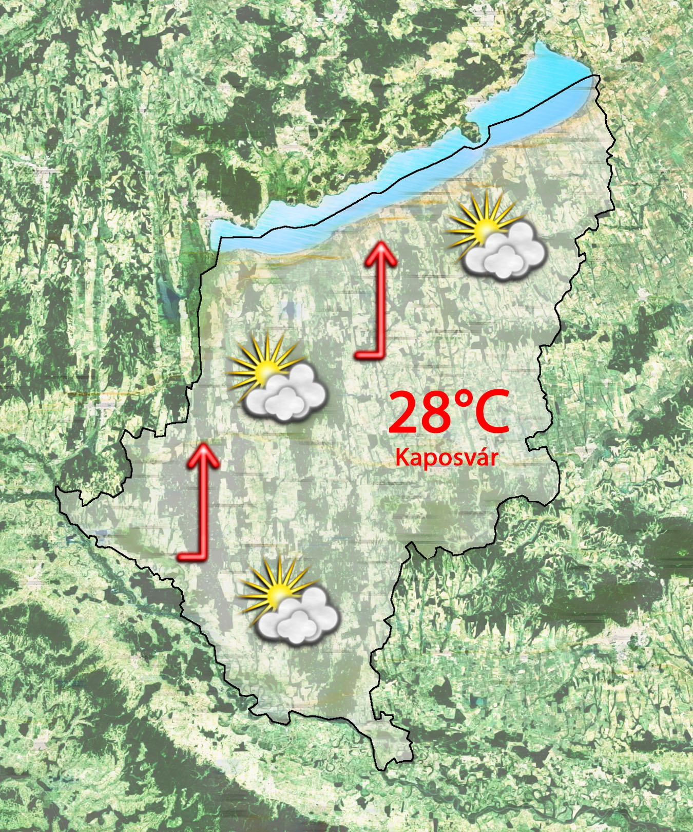 Kedd reggel 12°C-ig csökken hőmérséklet fátyolfelhős ég alatt. Délutánra 28°C-ig kúszik fel a hőmérő higanyszála a szűrt napsütés alatt. Gyenge lesz a déli szél.