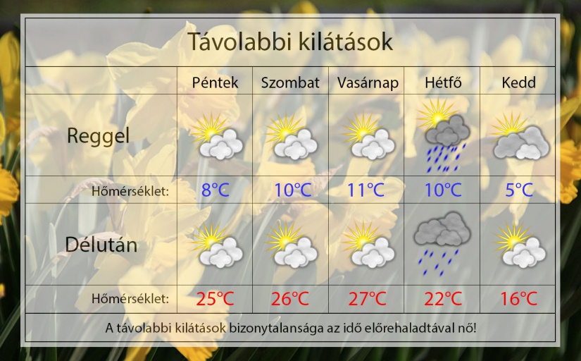 A hétvégén kellemes, koranyárias idő várható. Csapadéktól még nem kell tartani. Reggelente 10°C környékére csökken a minimumhőmérséklet, míg a délutánokon 25°C felett újból nyárias lesz majd az idő. A jövő hét elején azonban egy markáns hidegfrontra van esély.