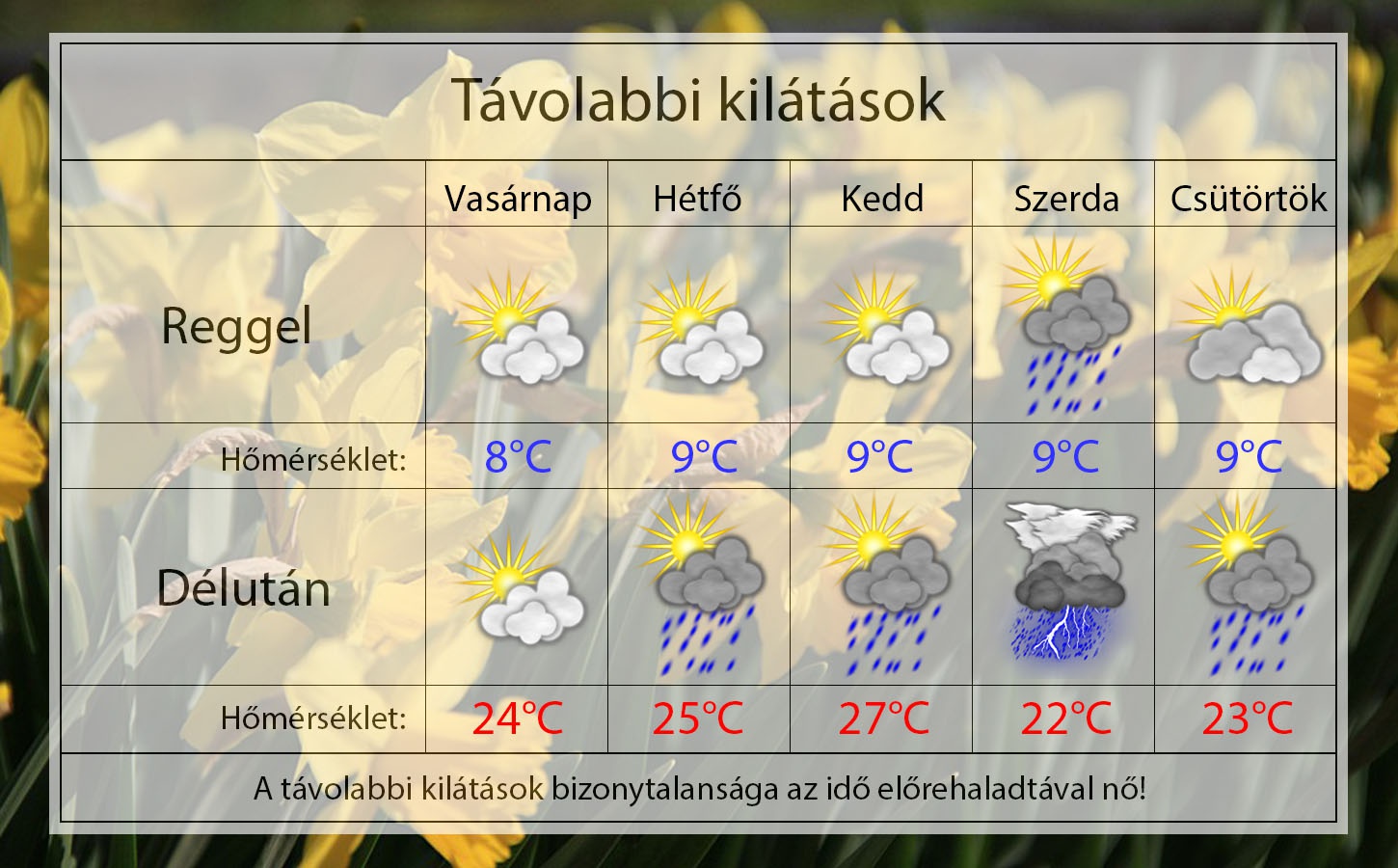 A jövő héten eleinte nyugodtabb lesz az idő, majd szerdától ismét sokfelé lehetnek záporok, zivatarok. Egy hidegfront is érkezhet. Reggelente 10°C környékére süllyed a hőmérséklet, míg napközben 25°C felett alakulnak a maximumok, de szerdára lehűlhet az idő. Közepesen felhős lesz az ég délutáni záporokkal, néhai zivatarokkal.