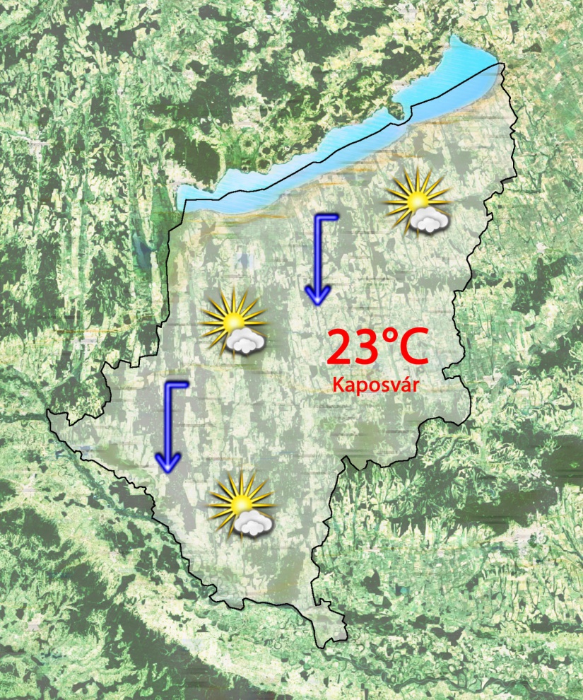 Szombat reggel 8°C-ig csökken a hőmérséklet a gyengén felhős ég alatt. Gyenge északi szél fúj majd. 24°C-ig kúszik fel a hőmérő higanyszála. Délutánra megnövekedhet a felhőzet de csapadéktól még nem kell tartani.