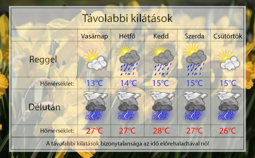 A jövő héten több helyen lehet zápor, zivatar egy sekély ciklon hatására. Heves zivatarok is előfordulhatnak. Reggelente 15°C környékére süllyed a hőmérséklet, míg napközben 25°C környékén alakulnak a maximumok. Igazi májusi aktív időjárás várható. A lokális csapadék miatt lehetnek olyan területek, ahol alig fog csapadék hullani, míg máshol akár egyhavi csapadékmennyiségek zúdulhatnak le.
