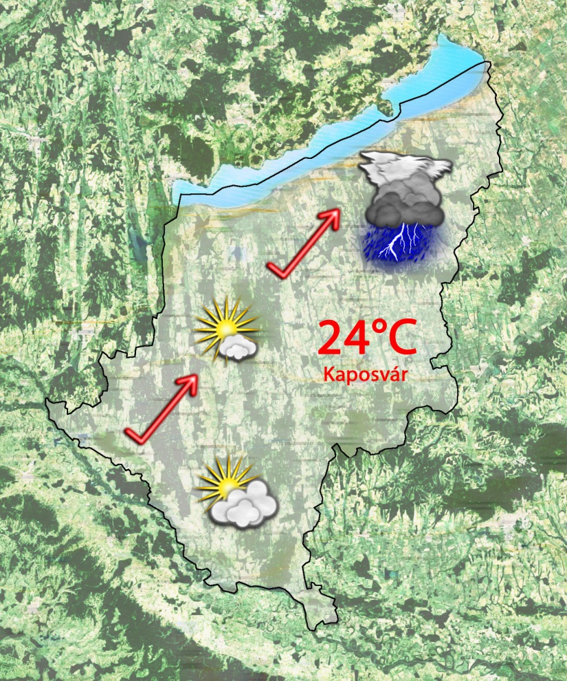 Péntek napközben eleinte erősen felhős lesz az ég és többfelé lehet záporeső, majd elkezd felszakadozni a felhőzet. Délután 24°C-ig kúszik fel a hőmérő higanyszála. Gyenge délnyugati szél fog fújni.