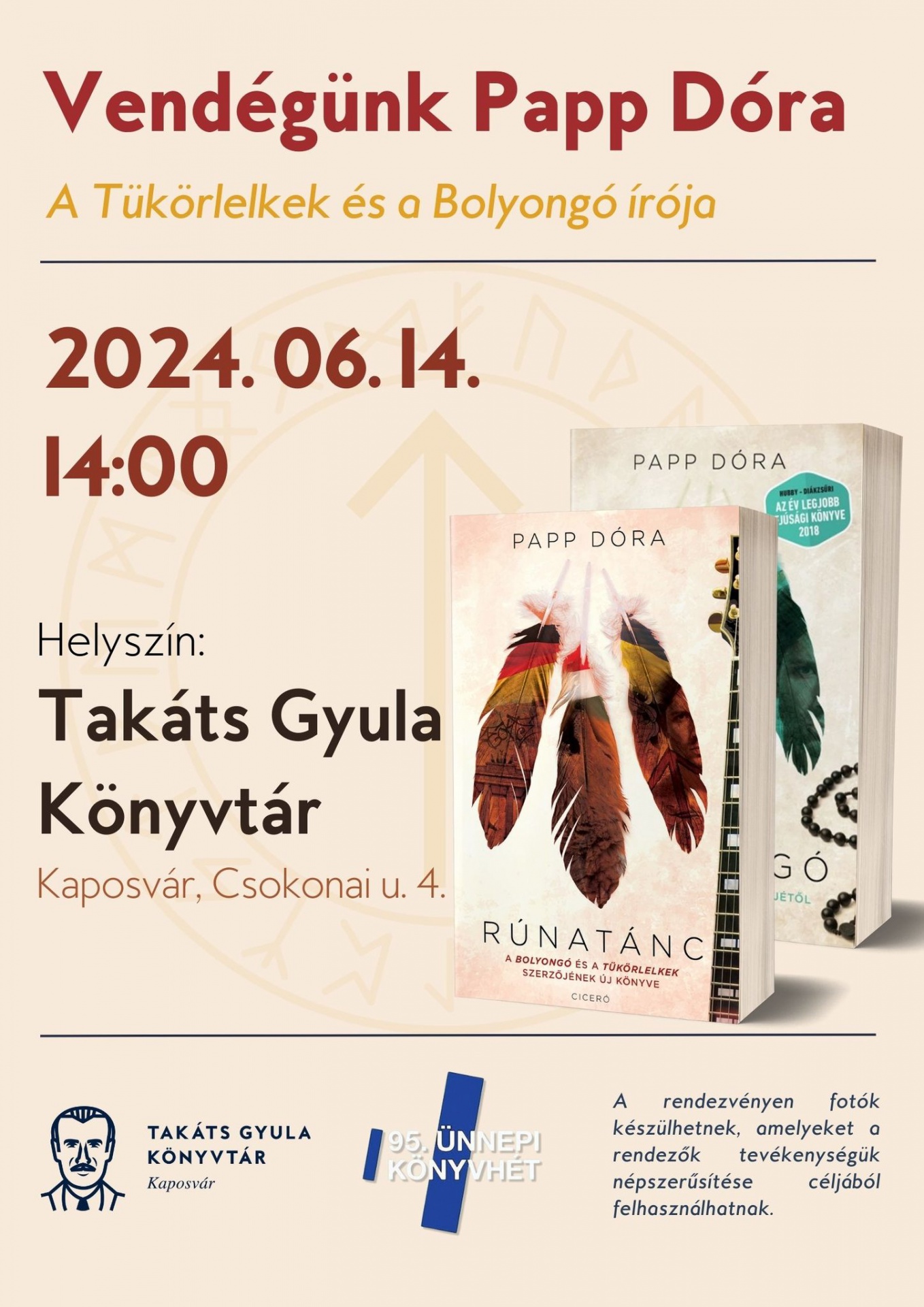 A 95. ünnepi könyvhét alkalmából, a Tükörlelkek és a Bolyongók íróját, Papp Dórát látják vendégül június 14-én, 14 órától a kaposvári könyvtárban.
