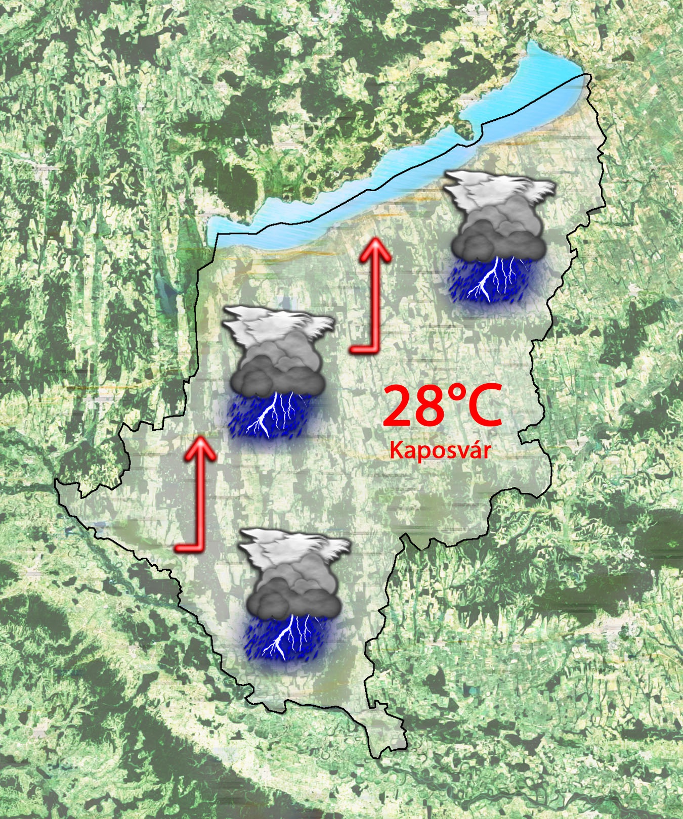 Szerdán napközben erősen felhős lesz az ég. Egyre több helyen lehet zápor, zivatar. Néhol a zivatarok rendszerbe szerveződhetnek. Heves zivatar is érkezhet, melyet jégeső és orkán erejű szél kísérhet. Gyenge lesz a délkeleti szél. Délután 29°C-ig melegszik a levegő. Estétől újabb zivatarok érkezhetnek dél felől.
