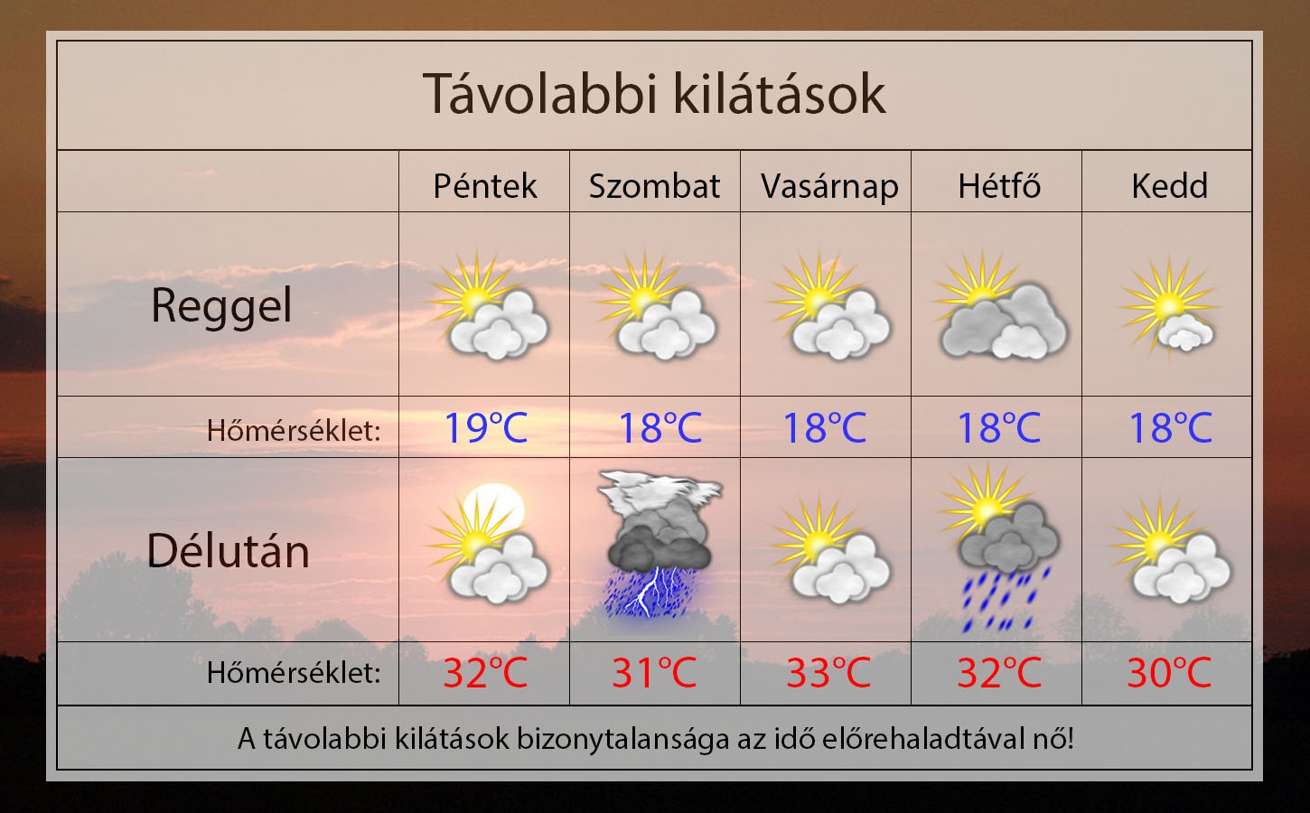 Pénteken reggel gyengén felhős lesz az égbolt és 18°C-ig hűl a levegő. Napközben marad a gyengén felhős ég és mellette 32°C-ig kúszik fel a hőmérő higanyszála. Gyengén fúj majd az északi szél.