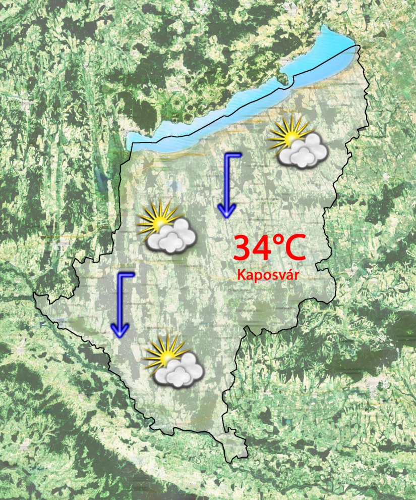 Szerdán napközben közepesen felhős lesz az ég. Néhol elfordulhat egy-egy záporeső, zivatar. Mérsékelt lesz az északi szél. Délután 34°C-ig melegszik a levegő.