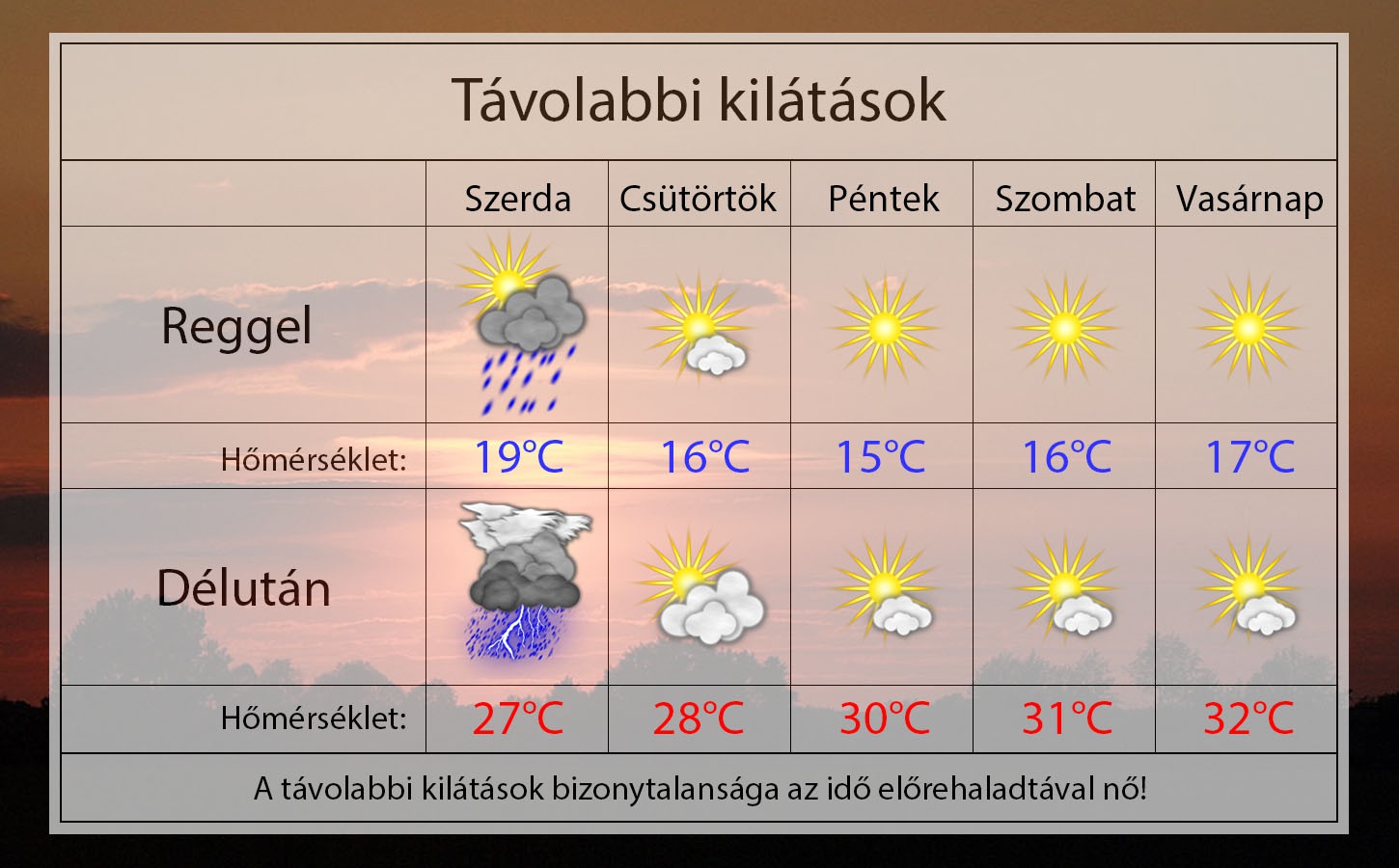A hét második felében melegszik a levegő a gyengén felhős ég mellett. A hétvégére igazi strandidő várható. A reggelek kellemesen frissek lesznek 14-17°C-kal, míg napközben 30-35°C között alakul a