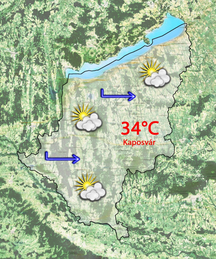 Csütörtök reggel 17°C-ig csökken a hőmérséklet a gyengén felhős ég alatt. Kellemes, friss idő várható. Napközben közepesen, fátyolfelhős lesz az ég. 34°C-ig melegszik a levegő a gyenge nyugati szél mellett.