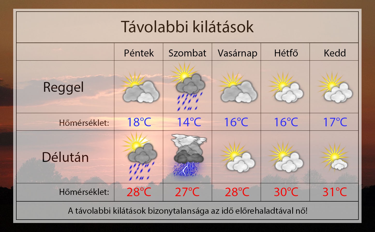 Pénteken reggel közepesen felhős lesz az égbolt és 18°C-ig hűl a levegő. Napközben egyre több helyen lehet zápor-zivatar egy hidegfront hatására. 28°C-ig kúszik fel a hőmérő higanyszála. Gyengén fúj majd az északnyugati szél.