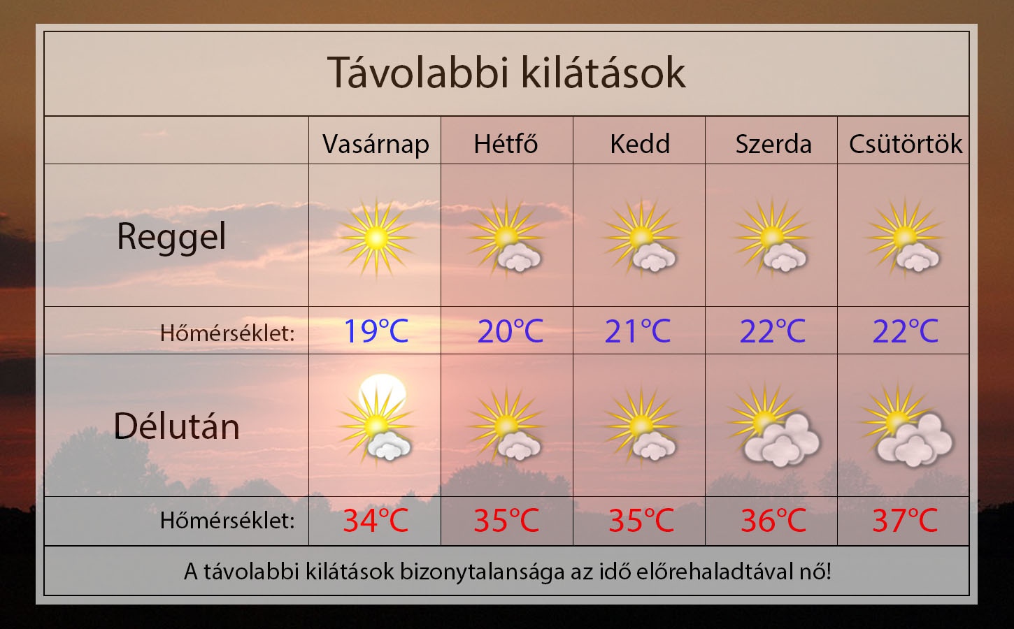 Vasárnap reggel 19°C-ig hűl a levegő a derült ég alatt. Napközben sok napsütés várható. 34°C-ig kúszik fel a hőmérséklet. Gyenge északnyugati szél fúj majd. Csapadéktól nem kell tartanunk.