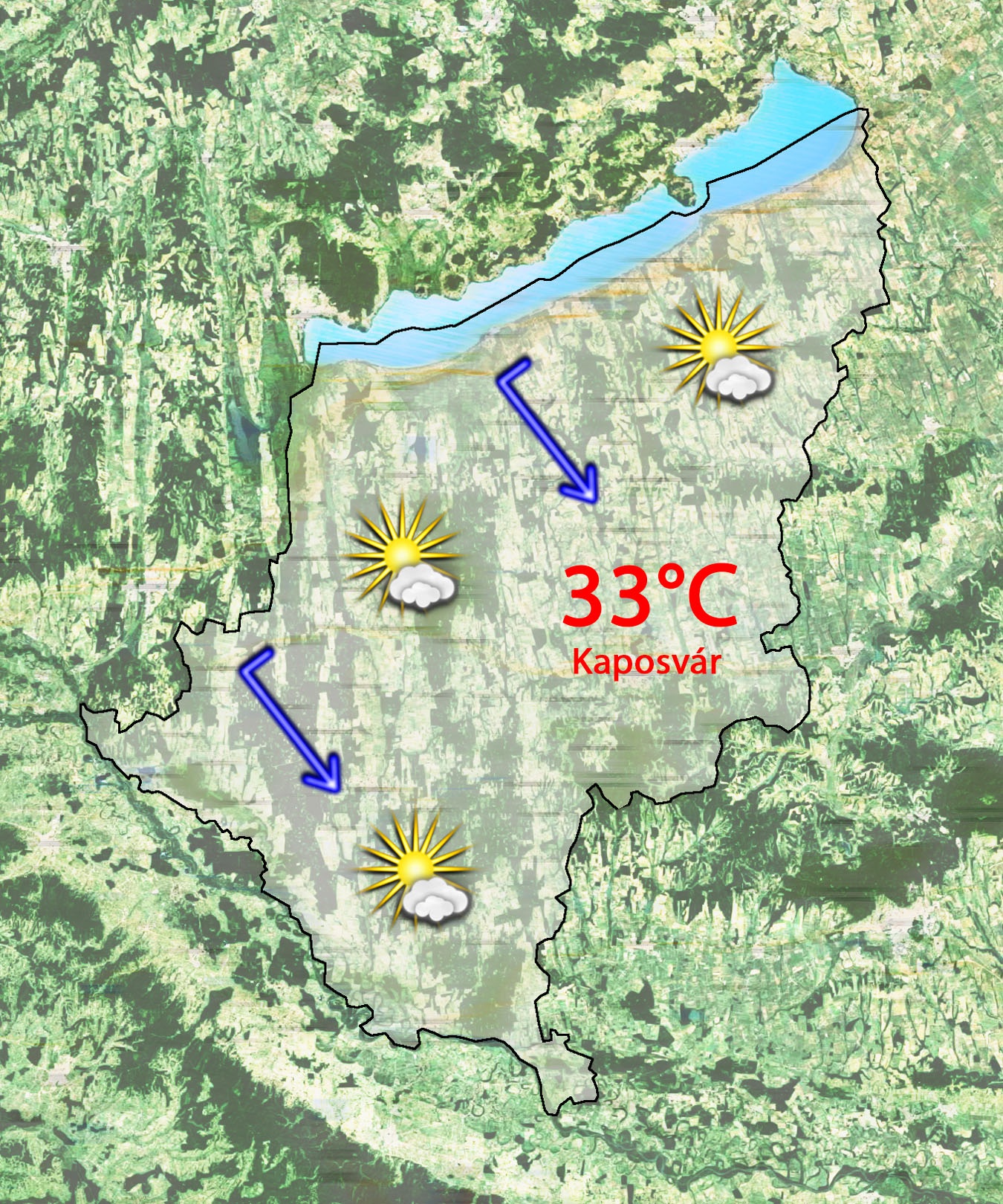 Szombat reggelre 19°C-ig csökken a hőmérséklet a derült ég alatt. Napközben gomolyfelhős ég várható. 33°C-ig kúszik fel a hőmérséklet. Gyenge lesz az északnyugati szél.