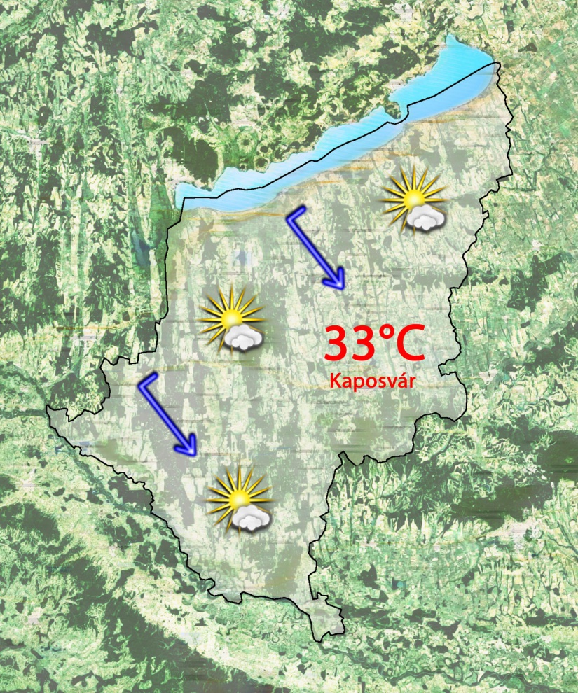 Péntek napközben közepesen felhős lesz az ég és közben 31°C-ig kúszik fel a hőmérő higanyszála. Mérsékelt, olykor élénk északnyugati szél fúj majd egy gyenge hidegfront miatt.