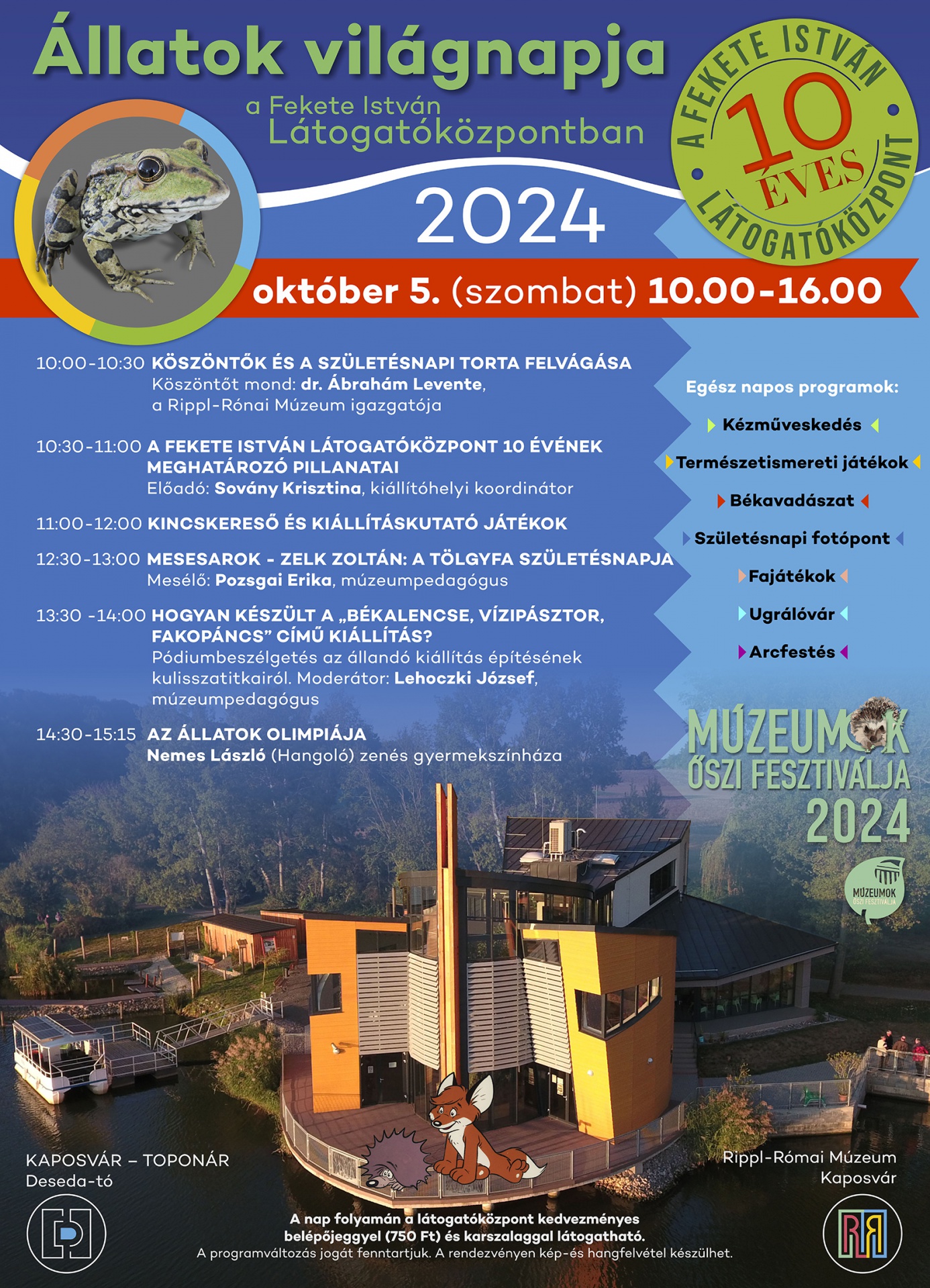 Lesz majd szülinapi torta és ünnepi köszöntő, valamint egy előadás a Fekete István Látogatóközpont 10 évének meghatározó pillanatairól. Mesesarokkal és egyéb játékokkal várják a gyerekeket, valamint lesz békavadászat és gyermekszínház is.