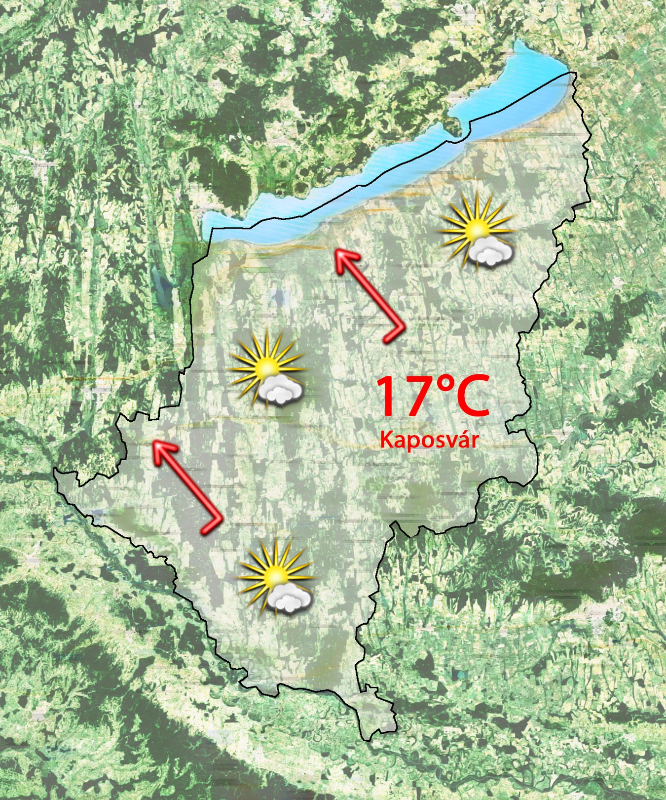 Kedd reggel gyengén felhős lesz az ég párafoltokkal. 4°C-ig csökken a hőmérséklet. Napközben gyengén felhős lehet az ég és sok napsütésben lehet részünk. Délután 18°C-ig kúszik fel a hőmérő higanyszála. Gyenge délkeleti szél fog fújni.