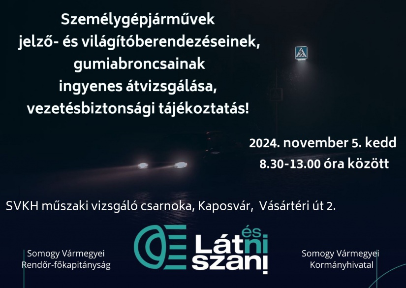 Az ingyenes autó átvizsgálással a kormányhivatal a rendőrség Látni és látszani kampányához csatlakozik. A kocsik tulajdonosait és üzemben tartóit kedden reggel 8:30-től délután 13:00-ig várják a Vásártéri úton.