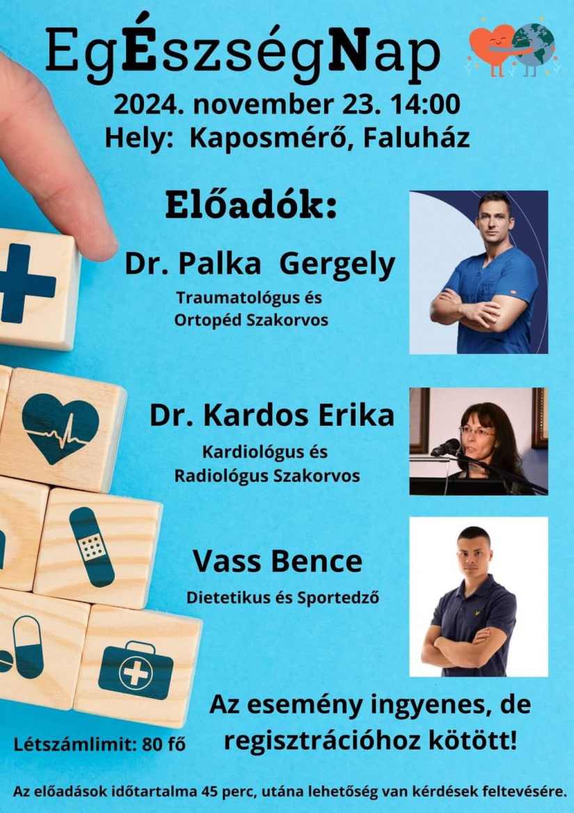 November 23-án a kaposmérői faluházba várják az érdeklődőket, akik egy ortopéd orvos, egy kardiológus és egy edző segítségével tudhatnak meg többet arról, hogy hogyan válhatnak eredményesebb sportolókká, az egészségük megőrzése mellett.