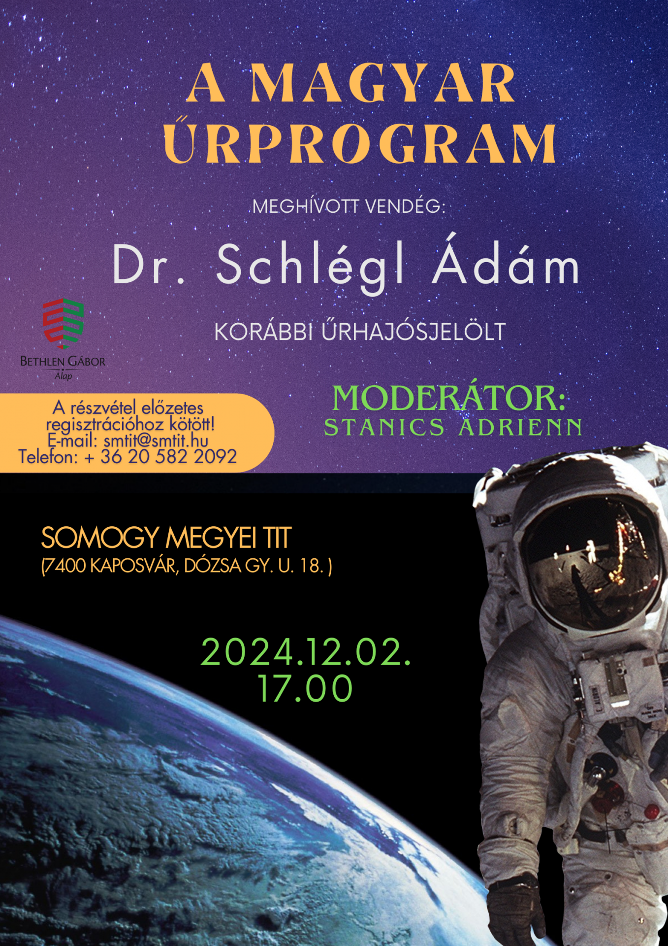 Kaposváron tart előadást Schlégl Ádám, Kaposváron született orvos, aki közel állt ahhoz, hogy ő legyen Magyarország következő űrhajósa. A 35 éves ortopéd sebész a magyar űrhajós programban egészen a végső döntésig reménykedhetett, ugyanis benne volt abban a négyesben a folyamatos rostálások után, akik özül kiválasztották hazánk új űrhajósát és a tartalké űrhajóst.