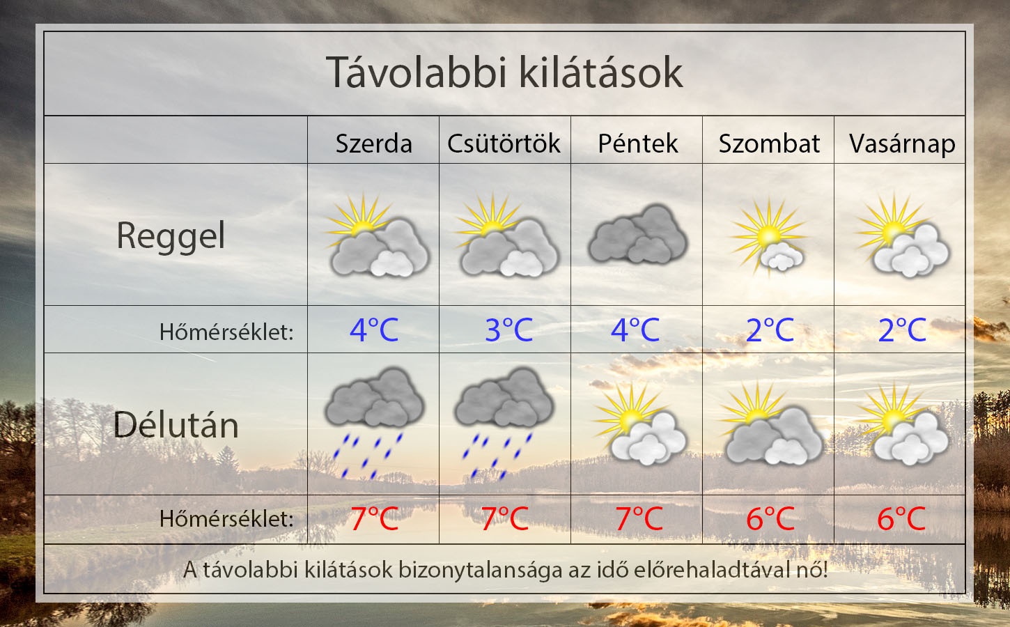 A hét második felében csütörtökön egy hidegfront érkezik, ami miatt esős idő lehet. Hétvégére kicsit megnyugodhat az időjárás, de még mindig sok lehet a felhő. Reggelente csak gyenge fagy lehet, vagy a sok felhő miatt el is maradhat, míg napközben 6-8°C között tetőzik a maximum.